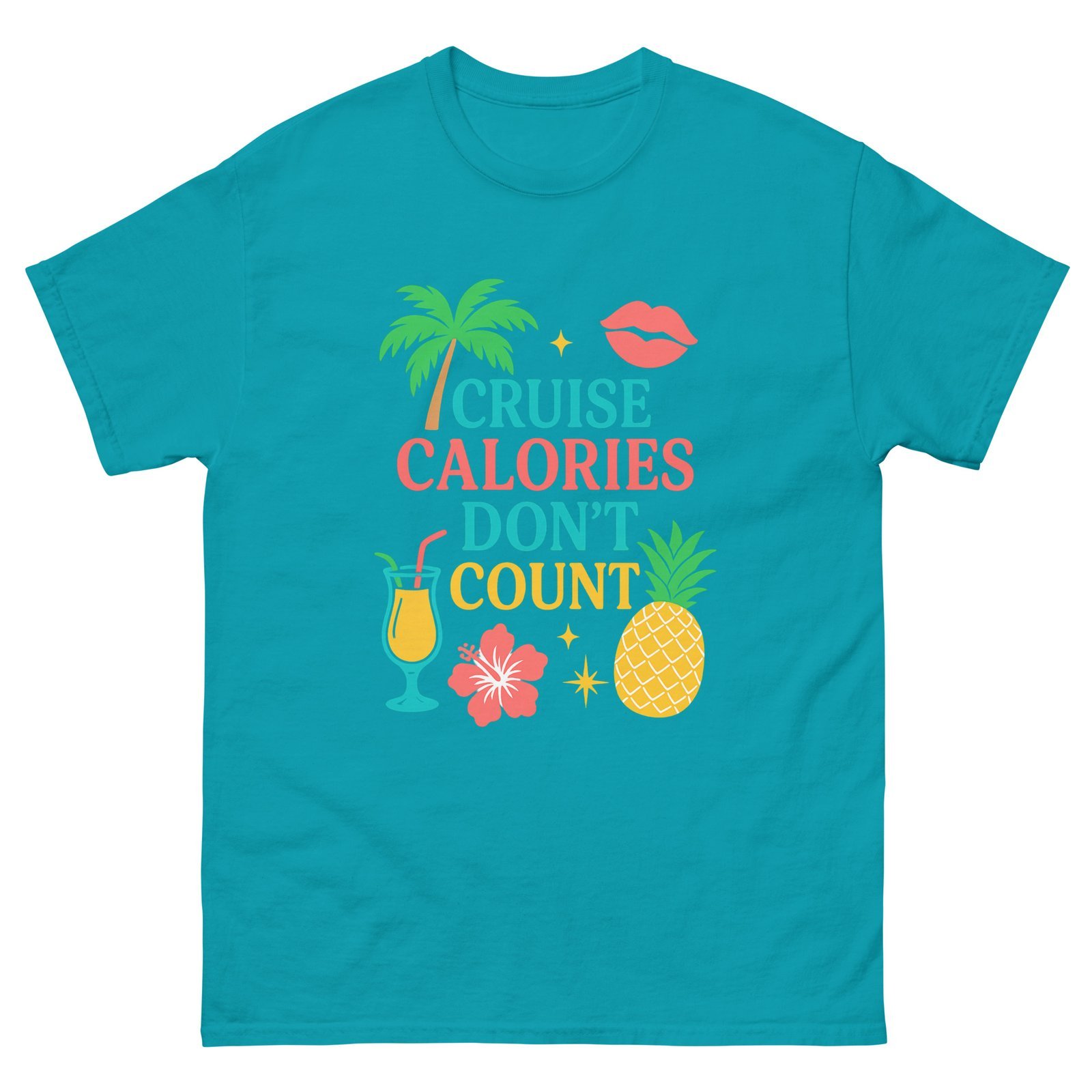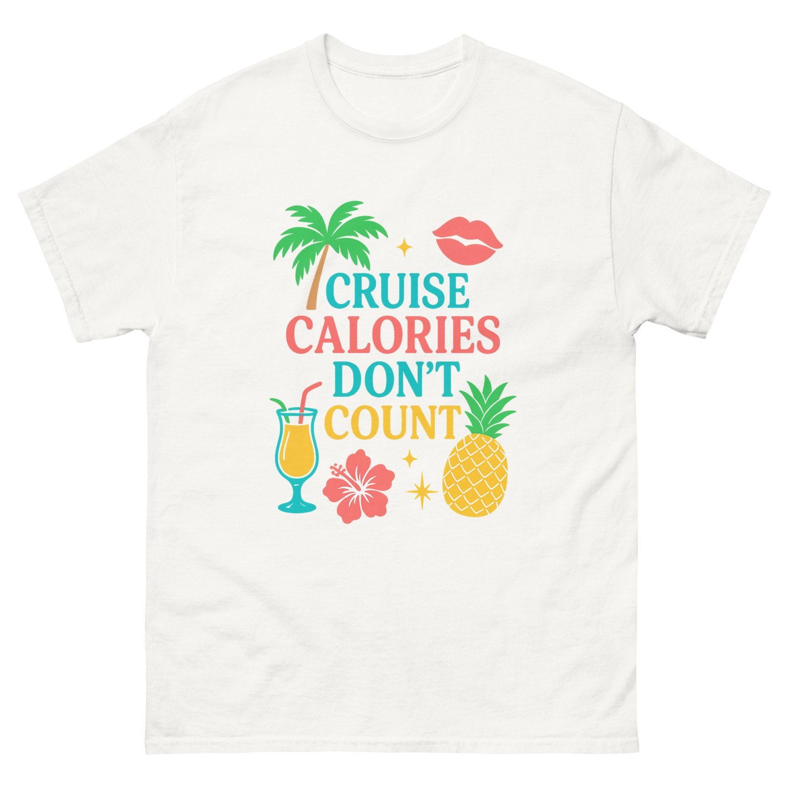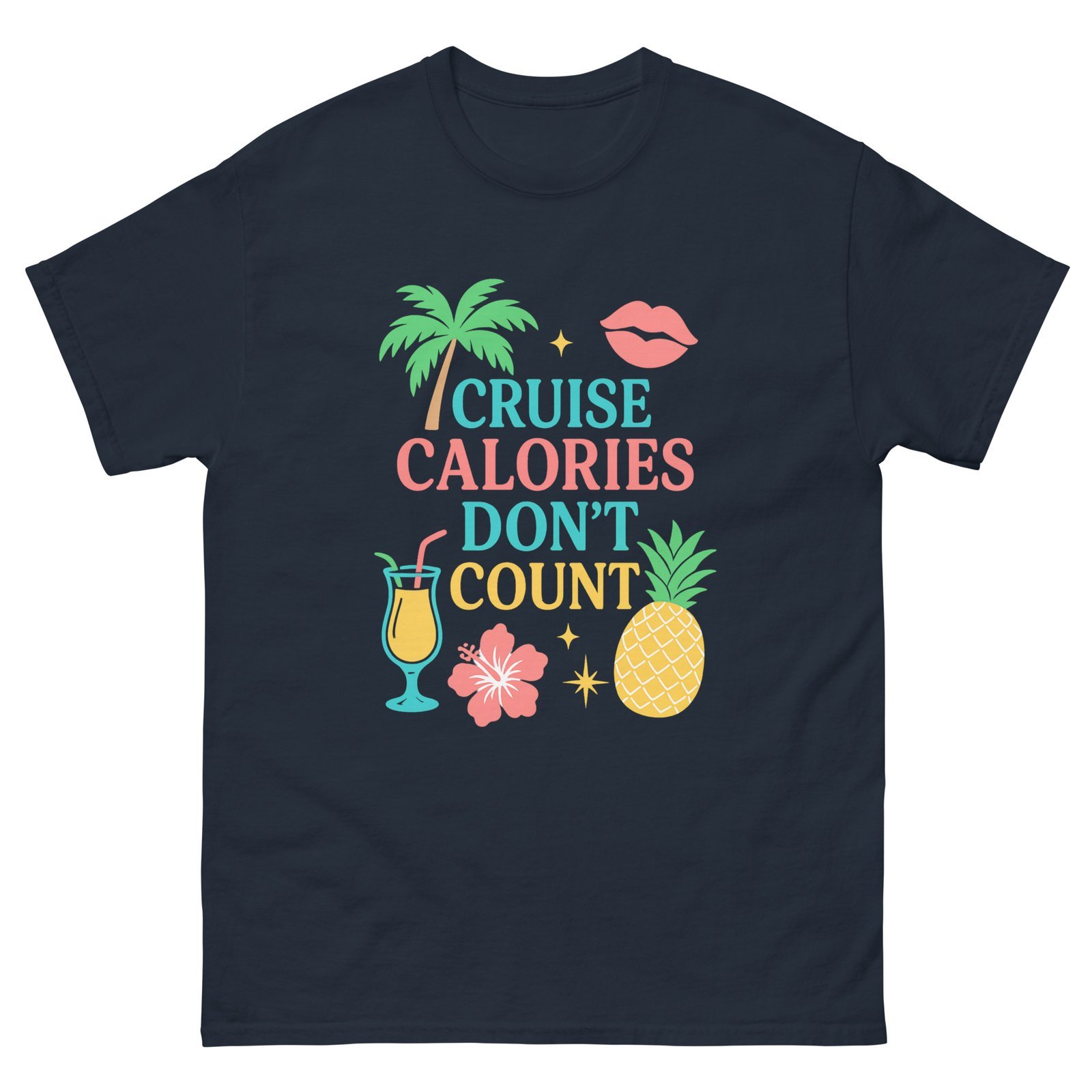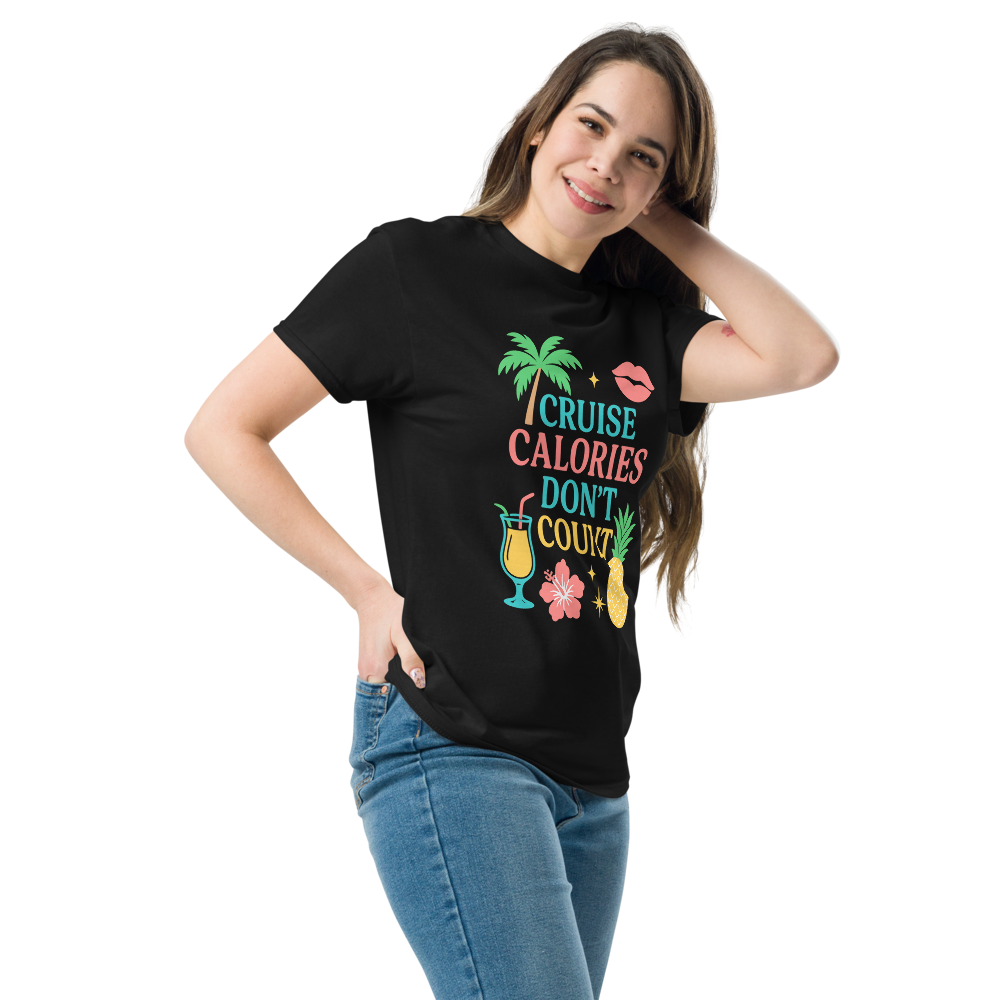 Set sail in style with this fun and tropical Cruise Calories Don’t Count tee! Perfect for cruise lovers who know vacation rules are different—especially when it comes to indulgence. Featuring a vibrant design with palm trees, fruity cocktails, pineapples, and tropical flowers, this shirt brings island vibes wherever you go.