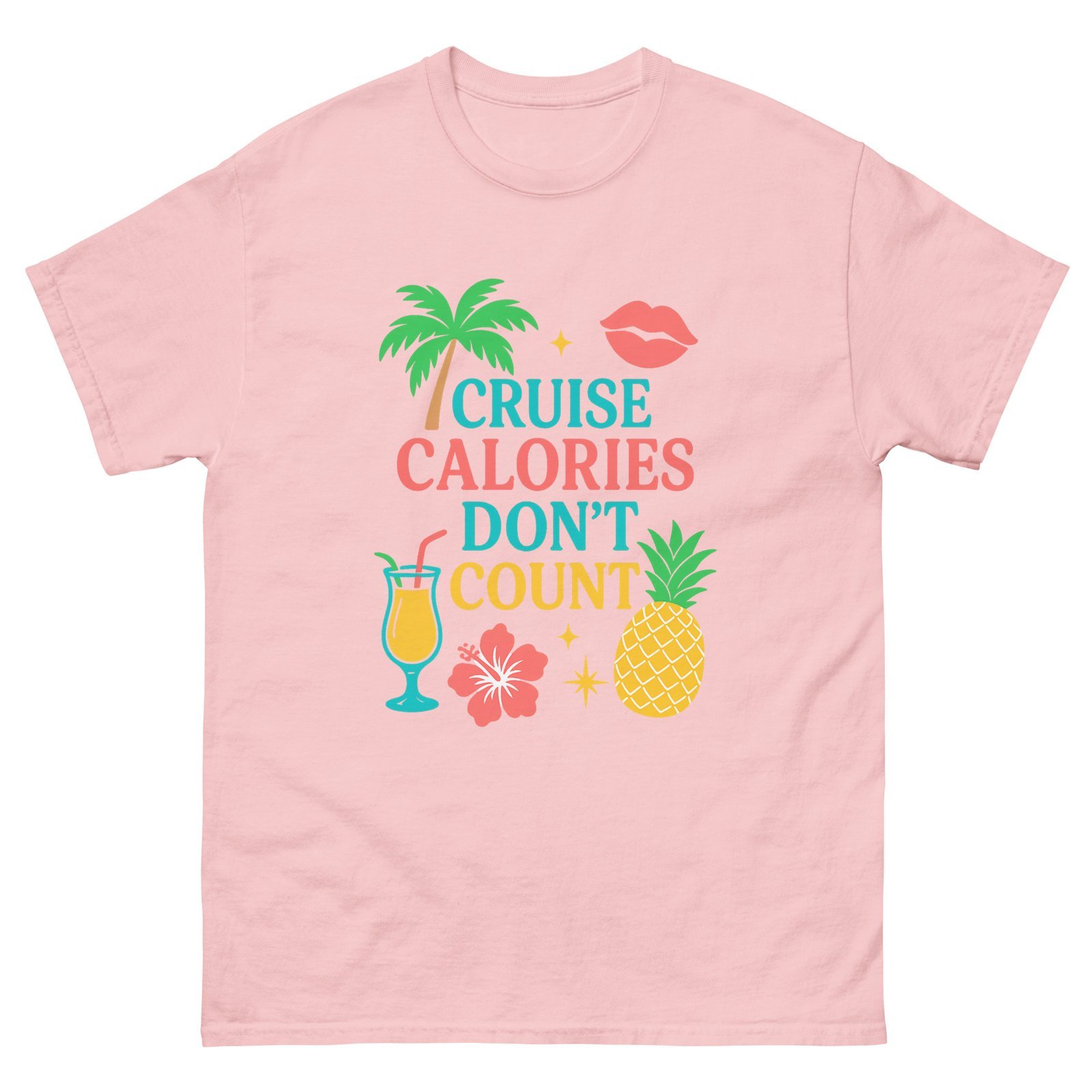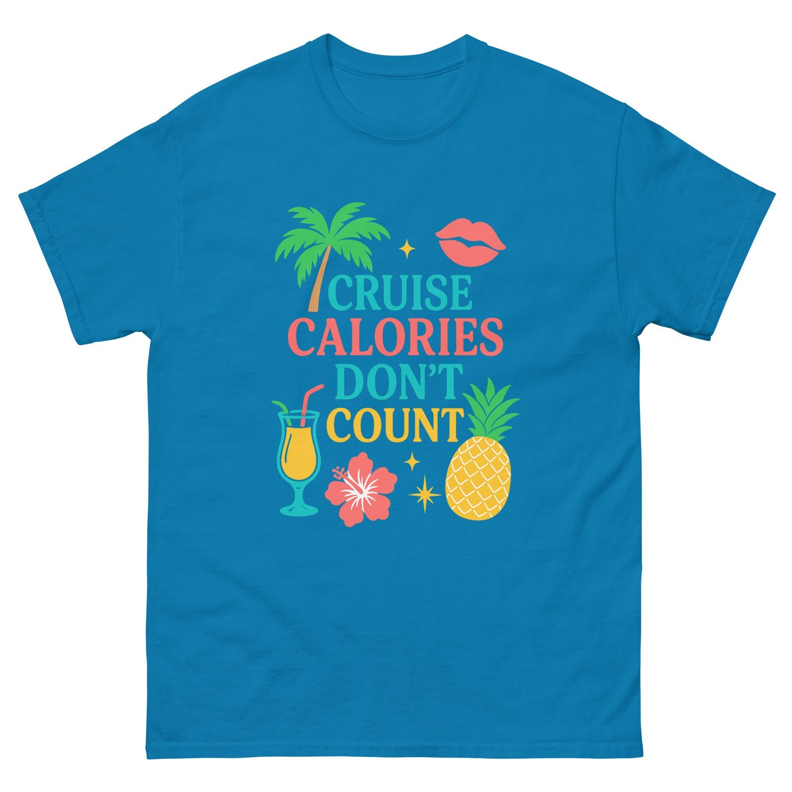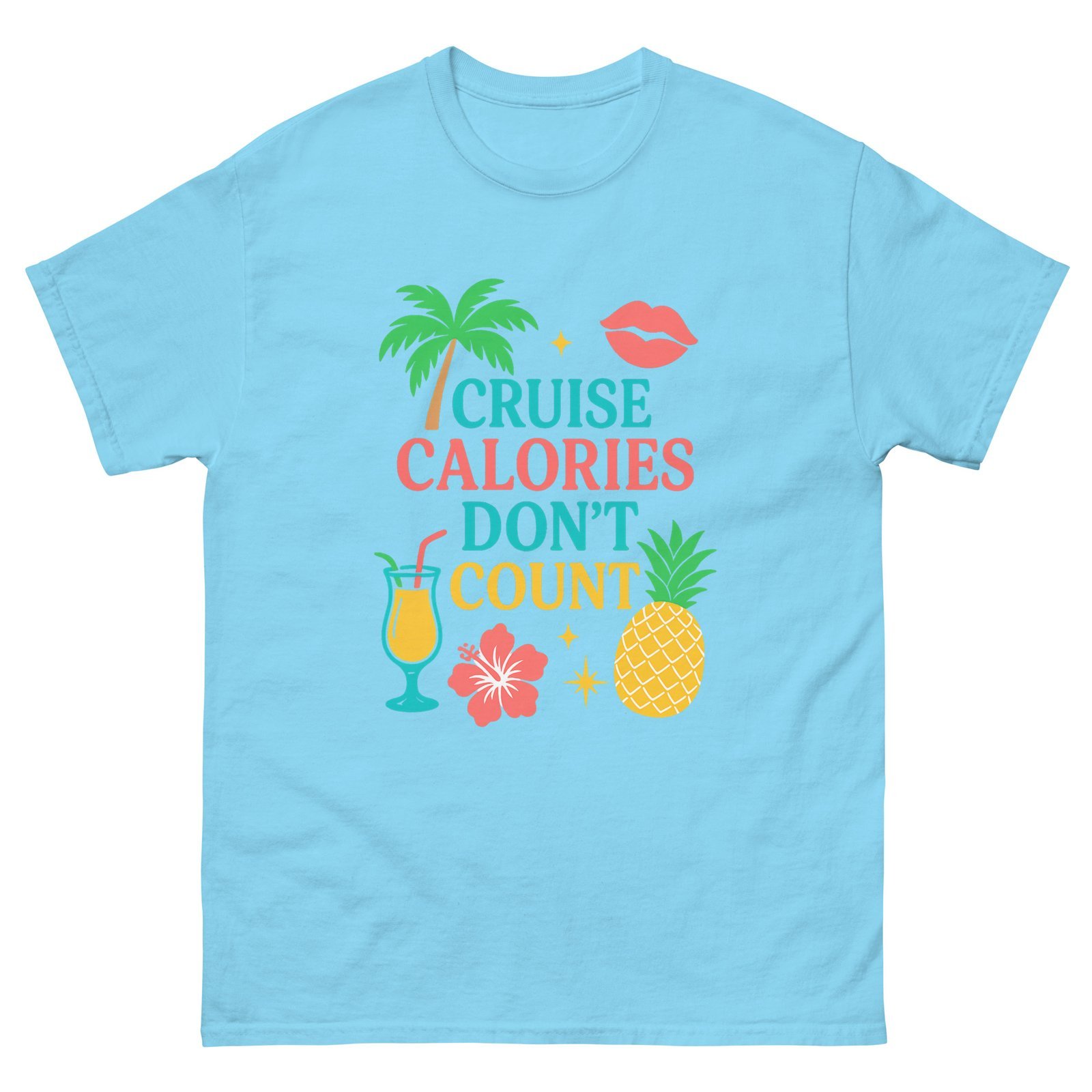 Set sail in style with this fun and tropical Cruise Calories Don’t Count tee! Perfect for cruise lovers who know vacation rules are different—especially when it comes to indulgence. Featuring a vibrant design with palm trees, fruity cocktails, pineapples, and tropical flowers, this shirt brings island vibes wherever you go.